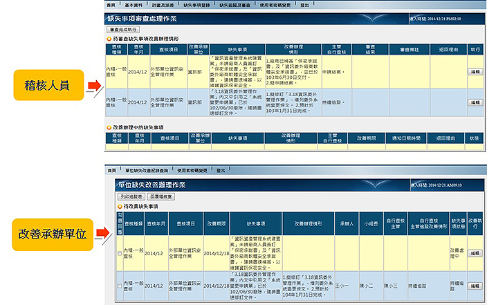 改善承辦單位收到稽核人員通知缺失改善辦理或通知退回改善辦理後,登入系統,立即可檢視待改善之缺失項目。
